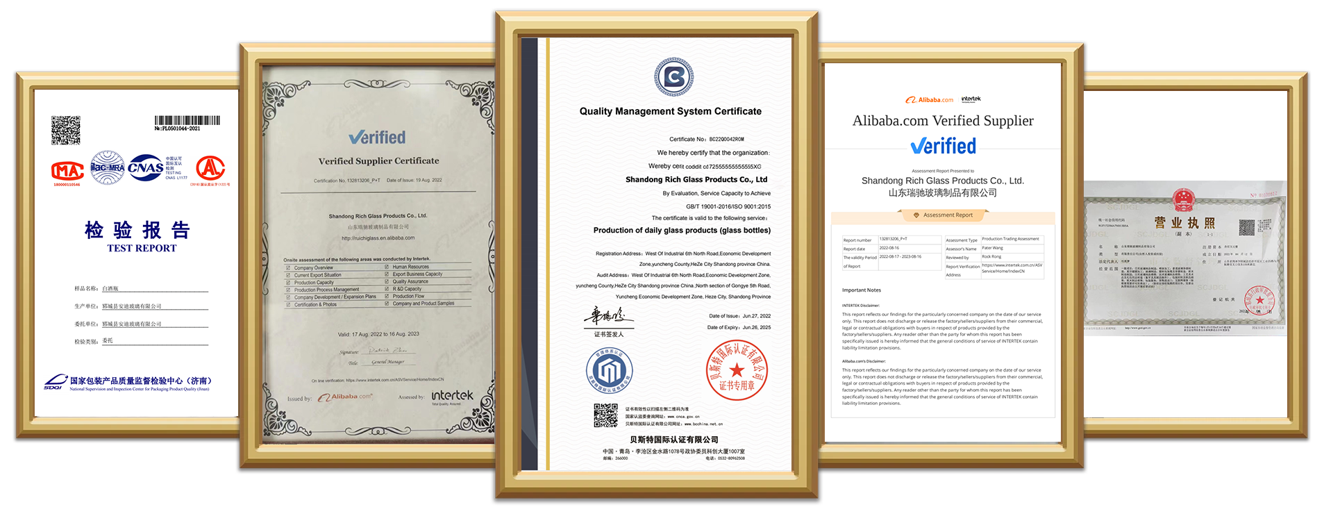 Наша компания имеет 15-летний опыт производства в сфере стеклянной упаковки. Это крупный профессиональный китайский производитель стеклянных бутылок, который занимается разработкой, производством, продажей и обслуживанием стеклянных бутылок. Он специализируется на производстве OEM/ODM различных типов бутылок по индивидуальному заказу, а также комплексных закупках. Вся продукция прошла сертификацию системы менеджмента качества ISO9001, а также SGS и другие сертификаты безопасности пищевых продуктов.
